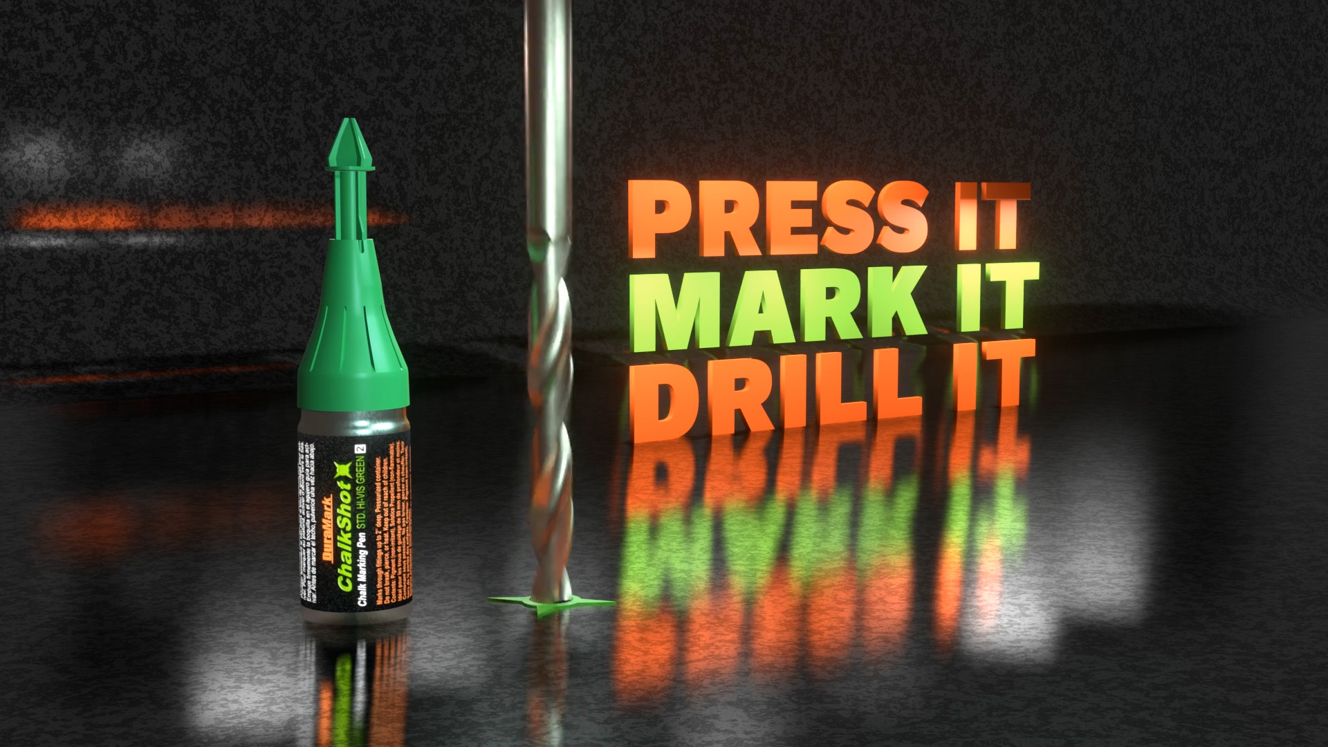 ChalkShot is a unique new tool that provides the only quick and easy high visibility non-permanent marking solution for drilling blind holes to affix brackets, handles and other items on hard to mark surfaces. The applicator shoots chalk on to the surface to be marked – there is no tip or pen nib to get damaged or clogged or dry out over time.